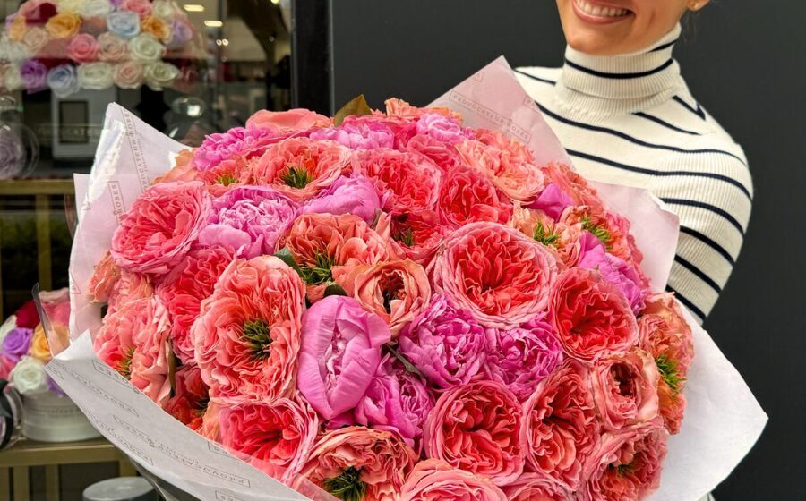 Una composición exclusiva que despierta emociones desde el primer instante. Una fusión de rosas, peonías y peonías premium que se entrelazan en una sinfonía de texturas, formas y colores, creando un ramo lleno de magia, elegancia y feminidad.