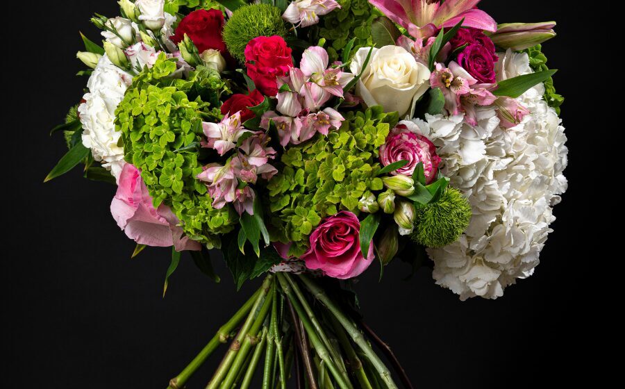 Un bouquet romántico y exuberante con hortensias y rosas peonias en armonía perfecta. Ideal para expresar amor, pasión y elegancia con un gesto inolvidable.