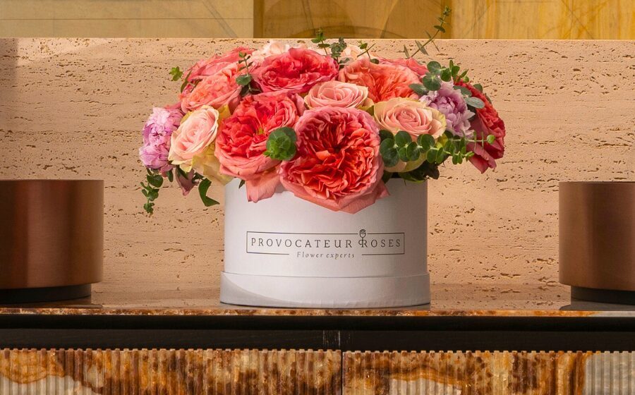 Una caja blanca de 22 cm que reúne la delicadeza y fuerza de rosas pink expression, rosas frutteto y peonías, acompañadas de verdes que aportan frescura y equilibrio.