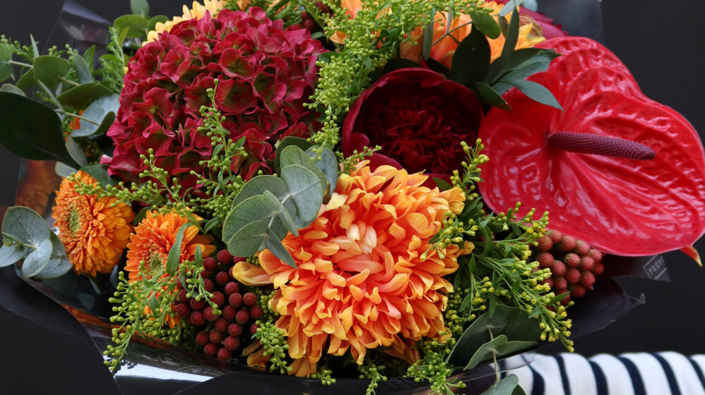 Nuestro ramo más otoñal formado por una combinación de colores tierra. Está compuesto por Anthurium Jrisantemo, Peonia, Brassica, Gerberas y mucho más en un elegante, exclusivo y otoñal ramo.
